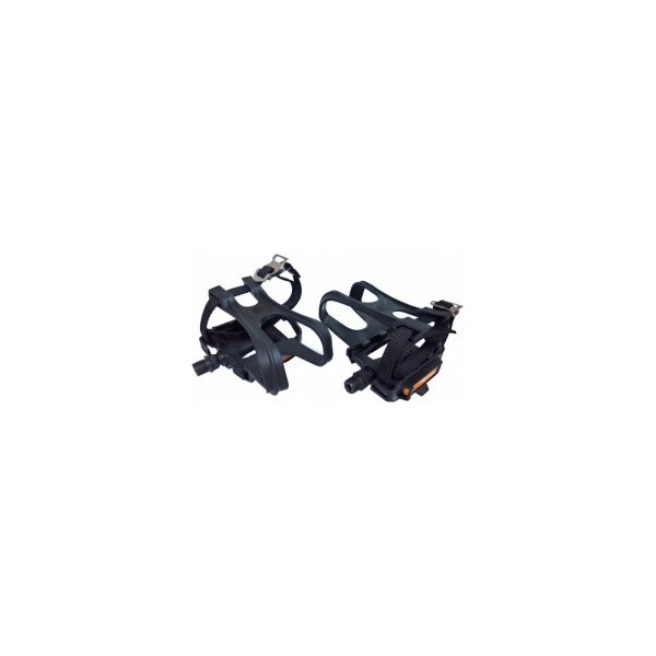 Plastové pedály, součástí jsou klipsny a řemínky. CrMo osa.
